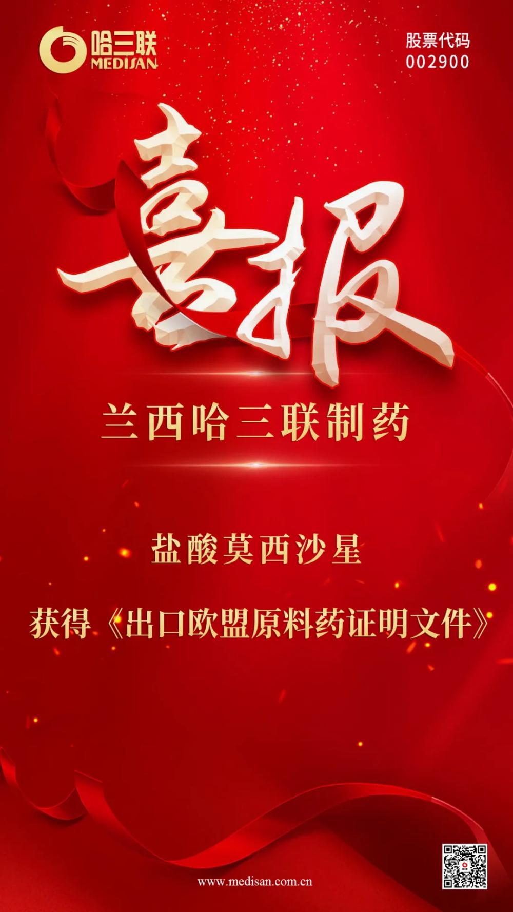1月23日,哈三聯(lián)全資子公司蘭西哈三聯(lián)制藥生產(chǎn)的鹽酸莫西沙星獲黑龍江省藥品監(jiān)督管理局正式簽發(fā)的《出口歐盟原料藥證明文件》,迎來公司原料藥國(guó)際化新突破,為進(jìn)一步拓展歐洲市場(chǎng)、深化國(guó)際合作提供有力保障。